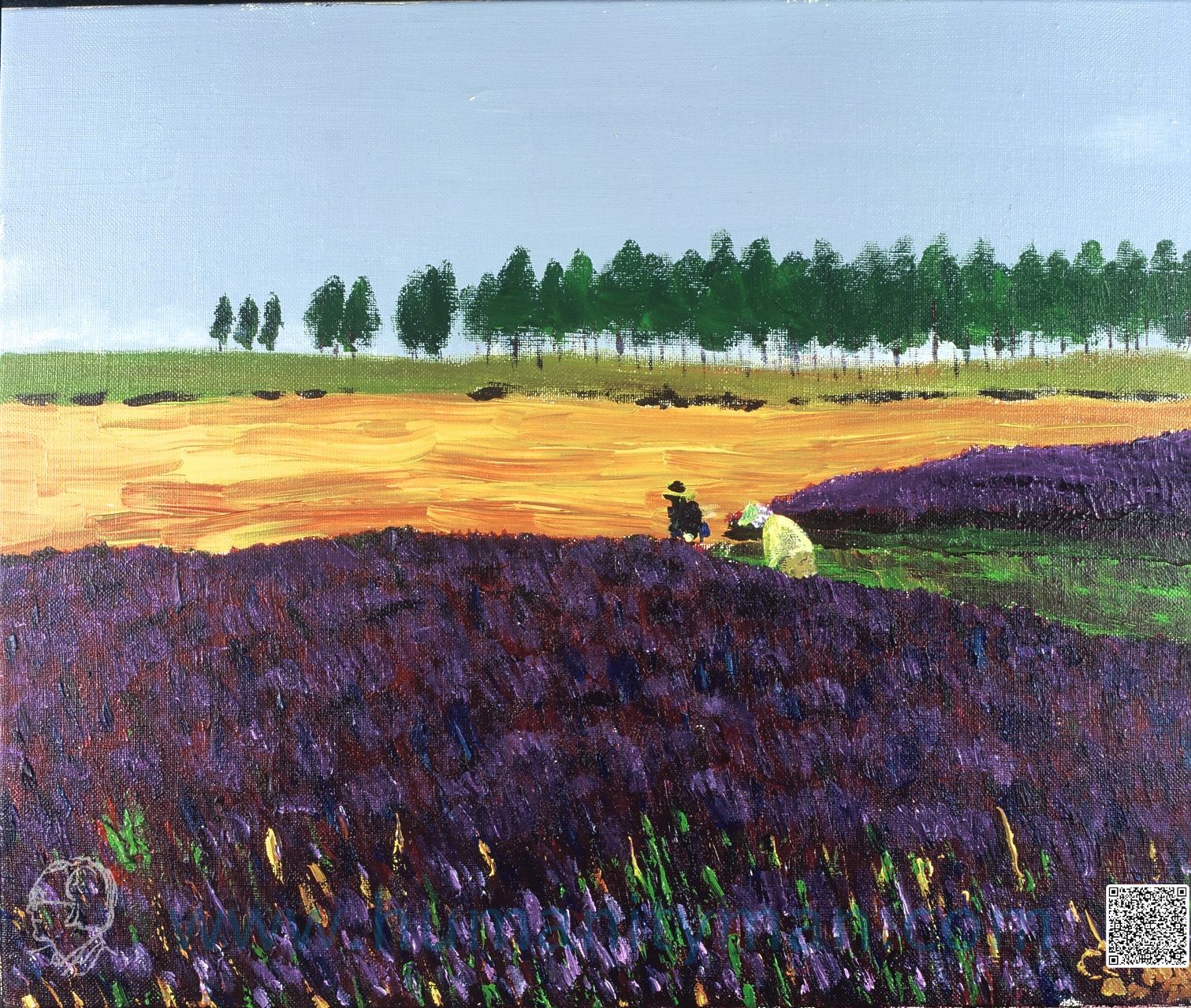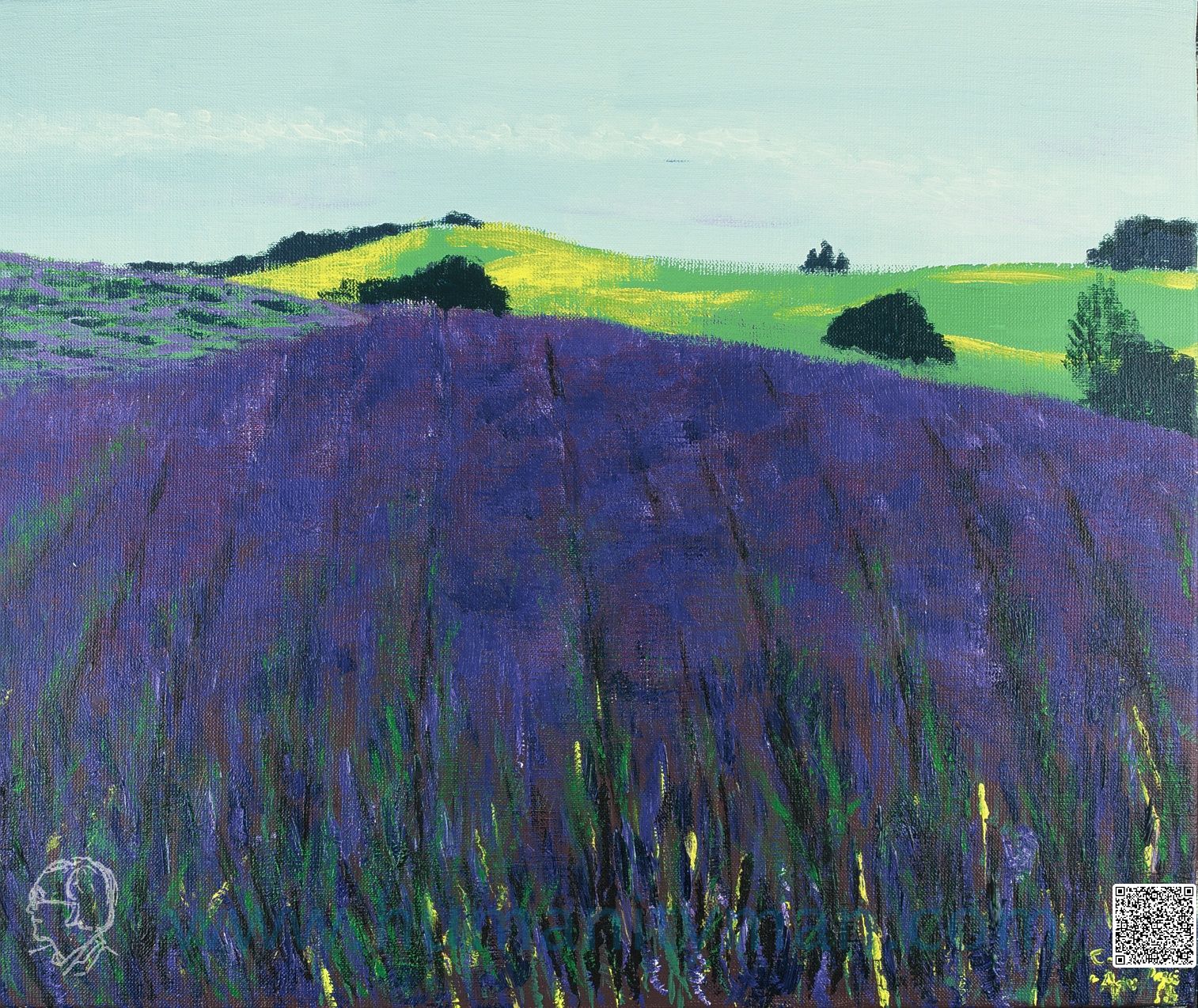 紫色的上富良野林布蘭壓克力彩 麻畫布 F8 1996年薰衣草本是歐洲的名產,可是對我而言,幾乎是夏天北海道的印象了。黃橙的麥田,紫色的花,把上富良野染得比歐洲更紫了,連葉子的綠也快看不見了。圖的藍本為前田真三的照片。_