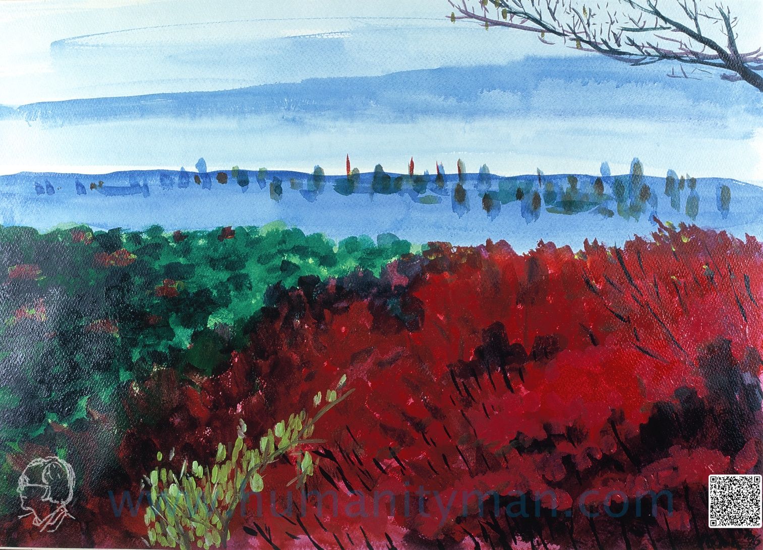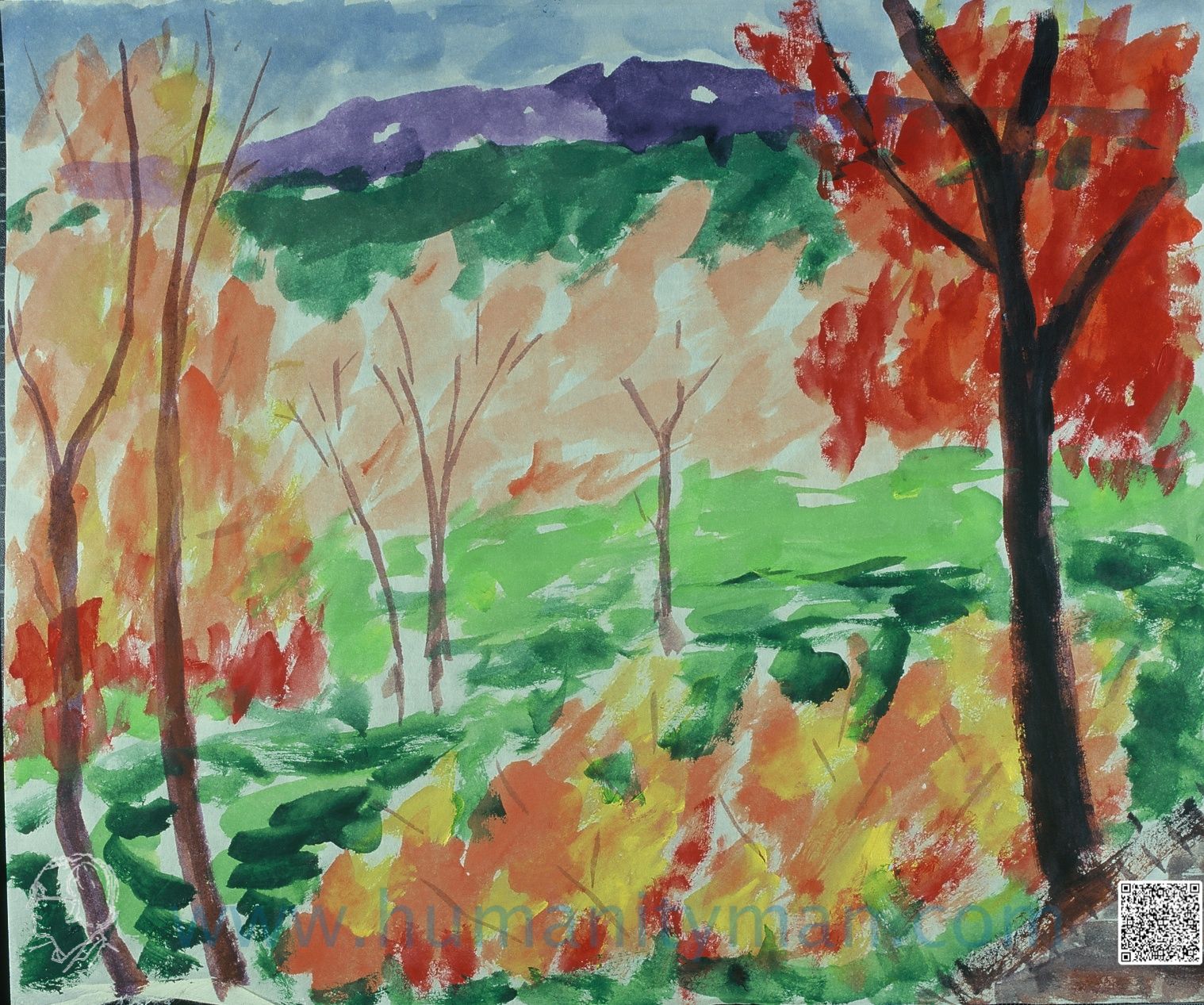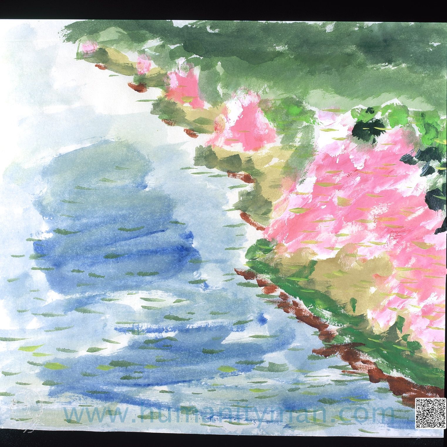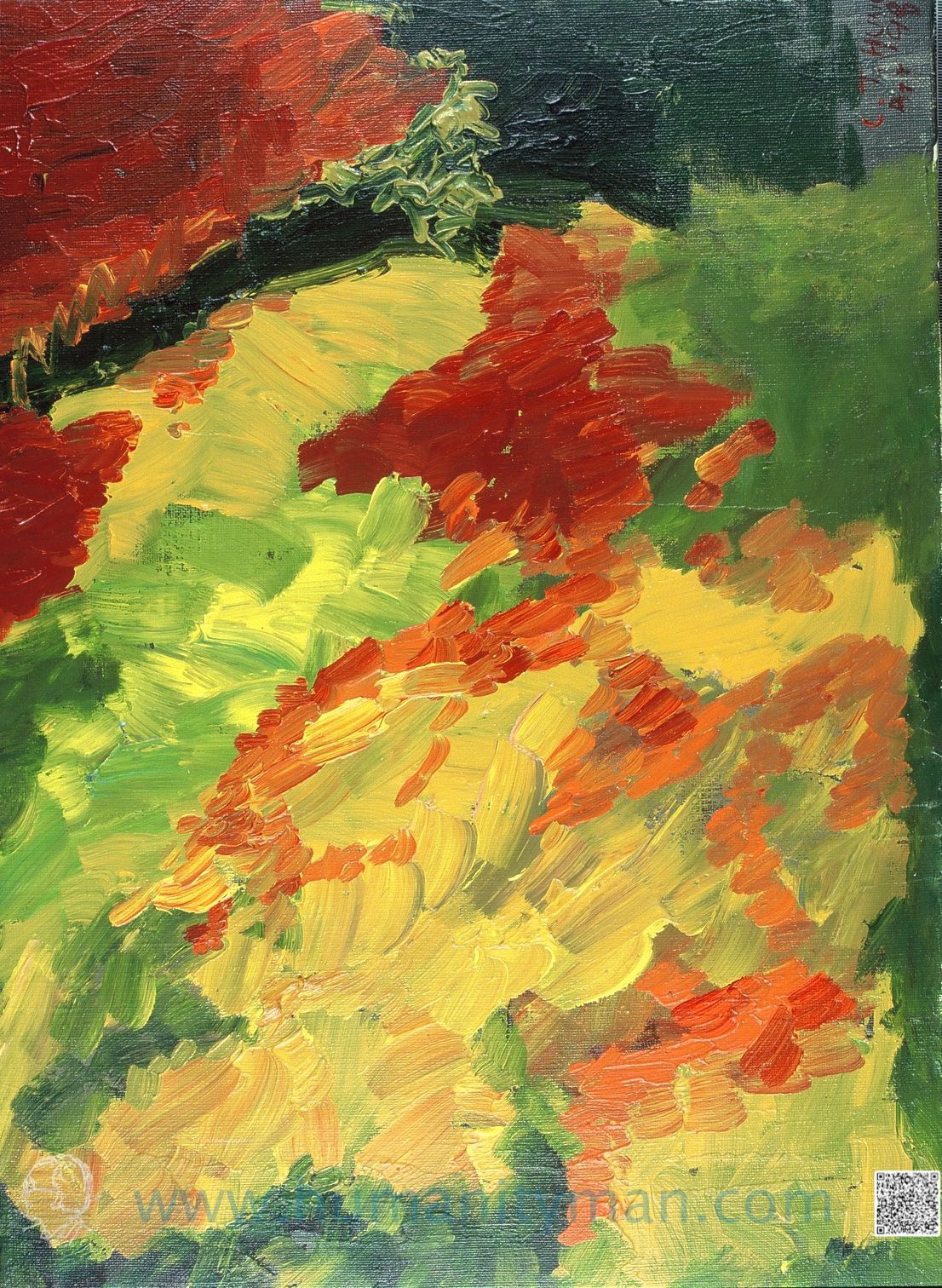 秋楓入禪 溫莎牛頓壓克力彩 和紙 八開 1997年這是使用壓克力彩畫在和紙的習作,壓克力雖然水性,但是溶解在壓克力多元聚合物裏,如膠似漆,並不容易在和紙上喧染開來,所以就吸住了,速乾。_