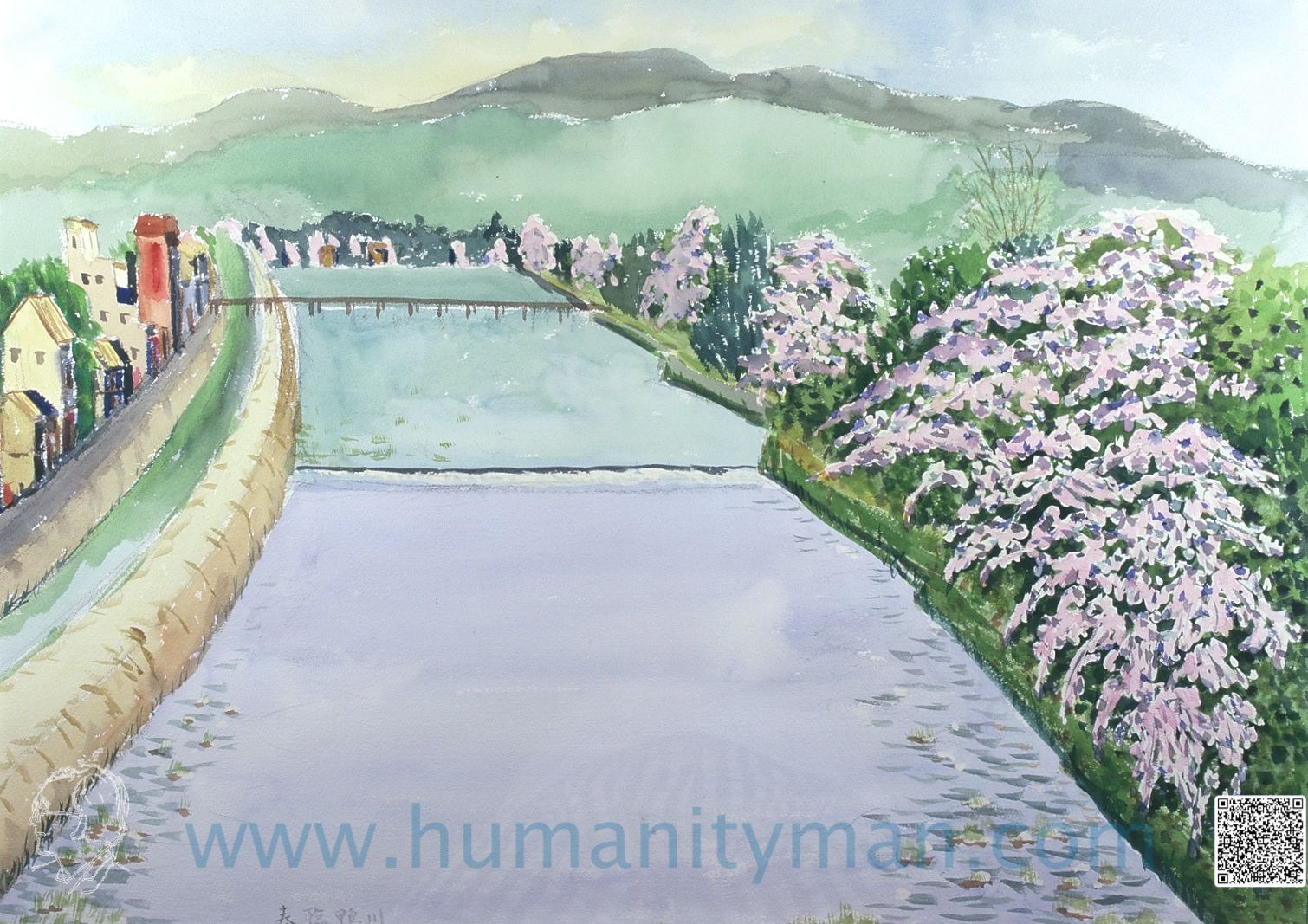 鴨川之春 學生級溫莎牛頓壓克力彩 水彩畫紙 八開 1996年 第一張壓克力的習作,由於用的是學生級的原料,與專家級的完全不同的質感與顏色,的確顏色比較輕浮,不夠穩重,不適我的畫風。_