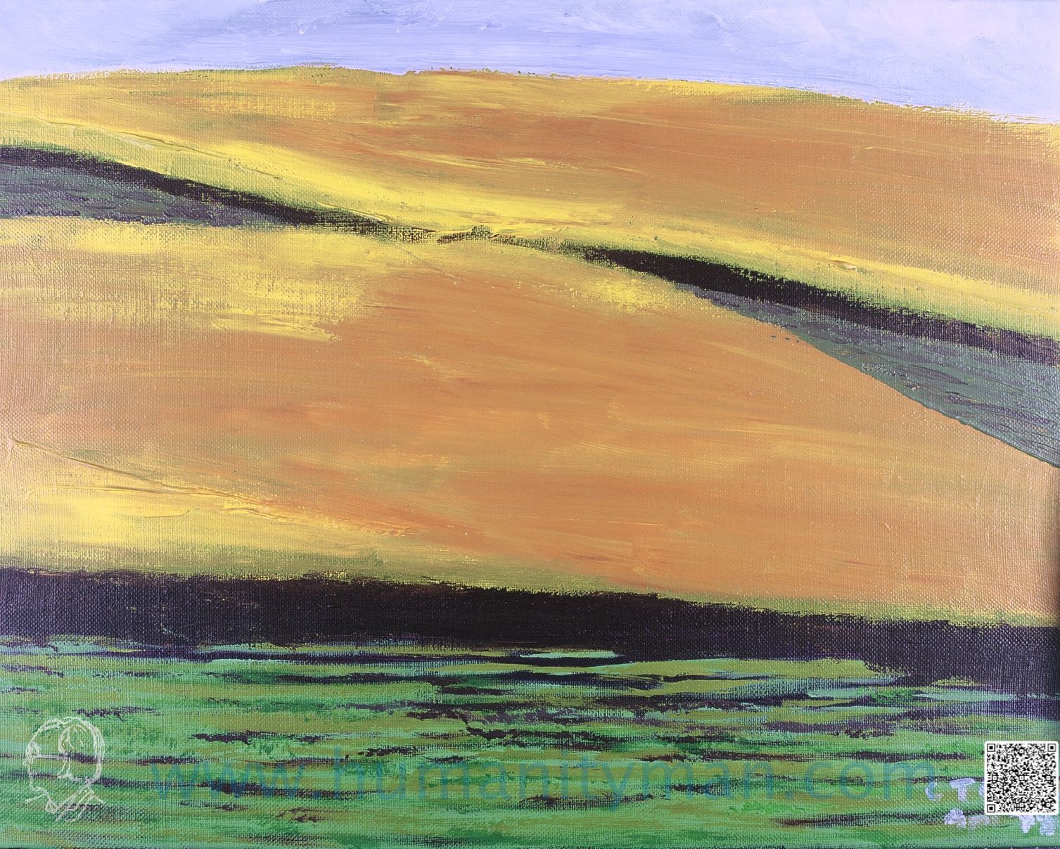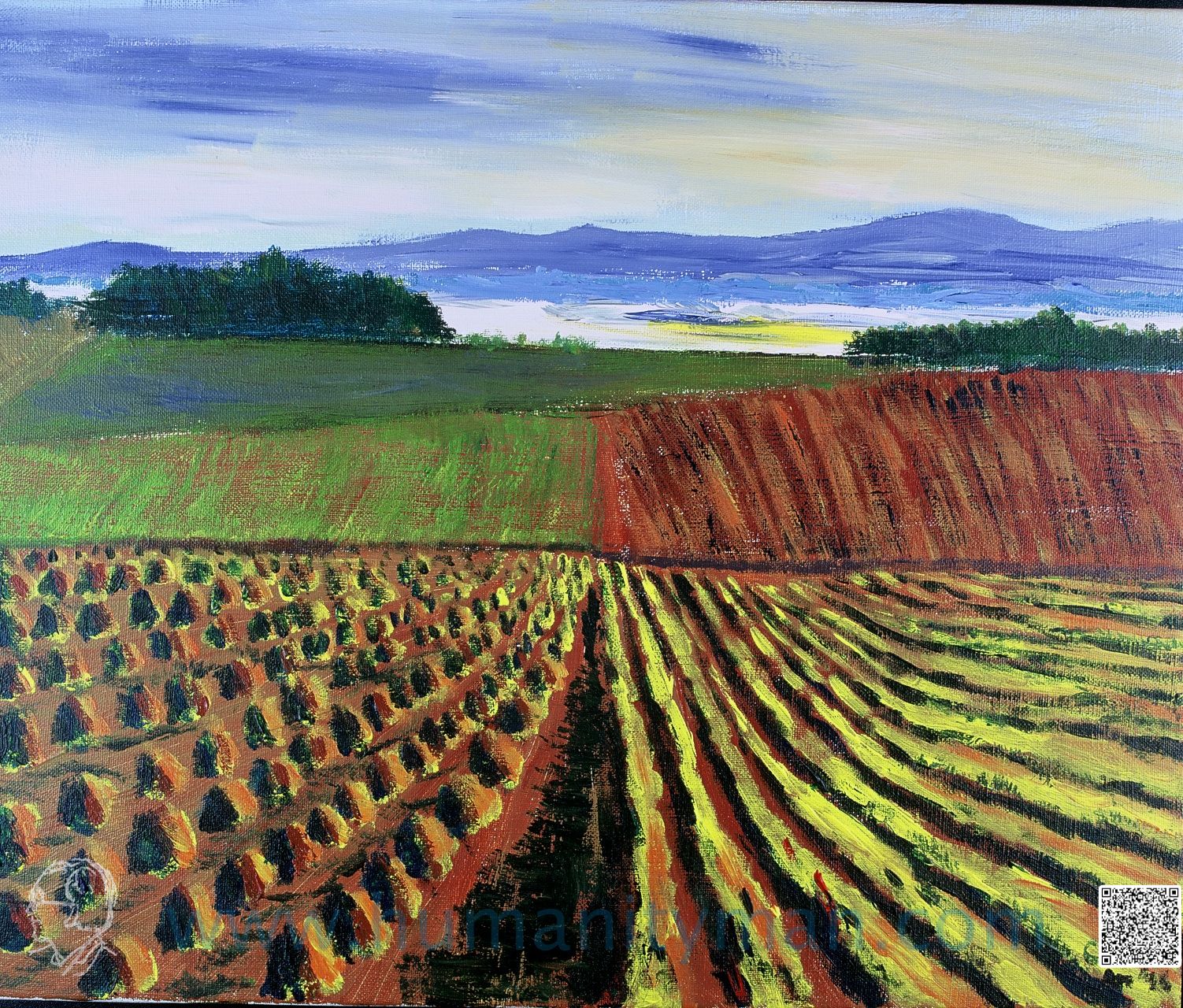 夏之丘 林布蘭壓克力彩 麻畫布 F8 1998年 北海道美瑛町,這麥田的豐腴就是當地人多年的努力,許多攝影家在這裡成名,而旅人的我也跟著高興,因為我知道今年秋天他們會豐收。_