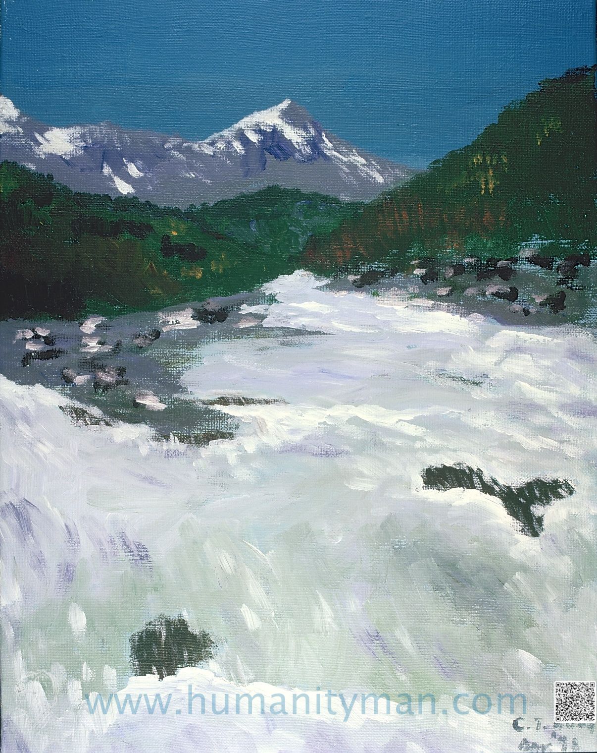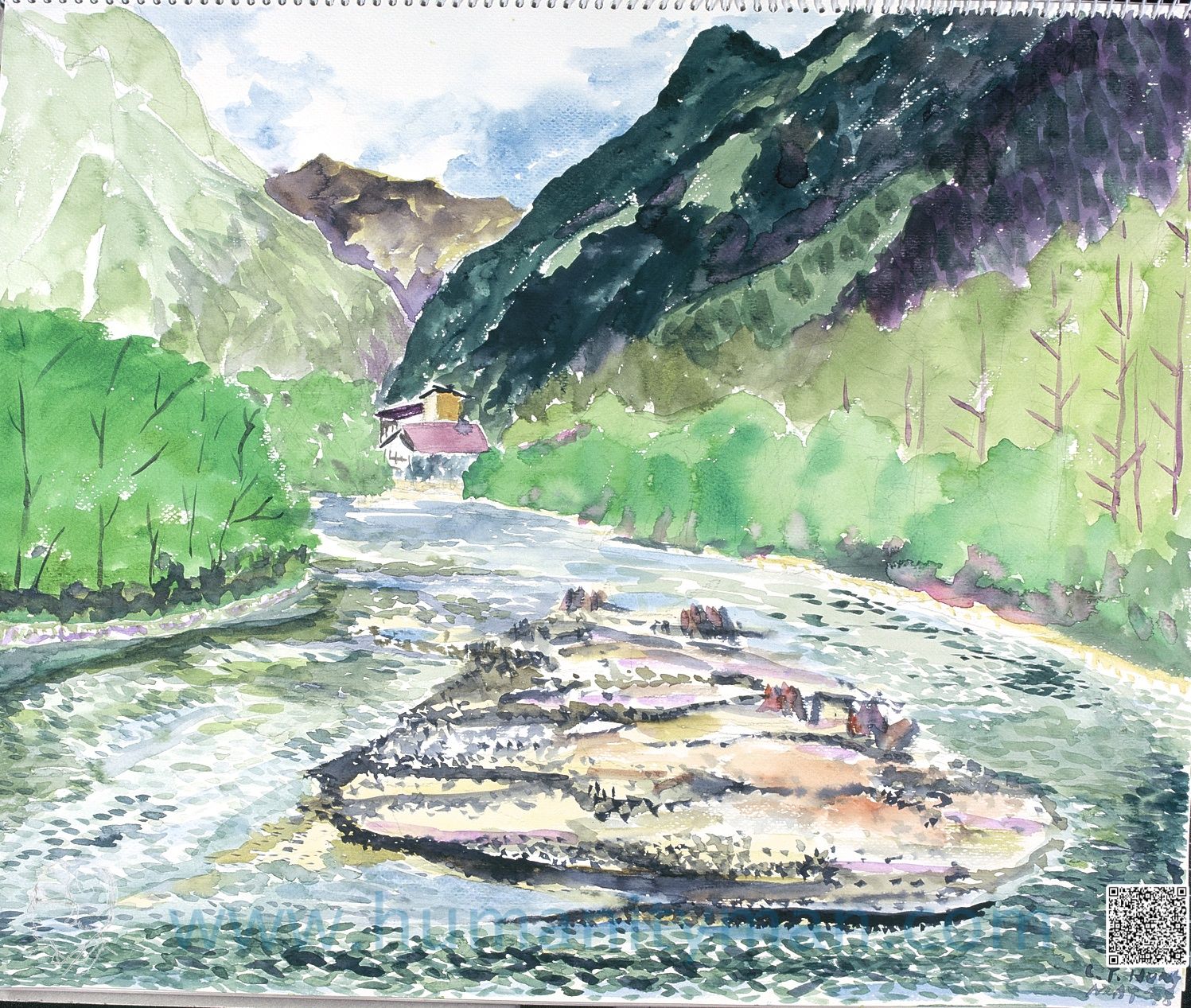 梓川溫沙牛頓水彩 日本水彩紙 F8 1998年梓川的水乾淨的可以當自來水,每天有那麼多的遊客,開放一百年還能乾淨,靠的是國民高水準垃圾帶下山,盡職的公園管理管員,以及完善沒有被污掉的下水道工程。_