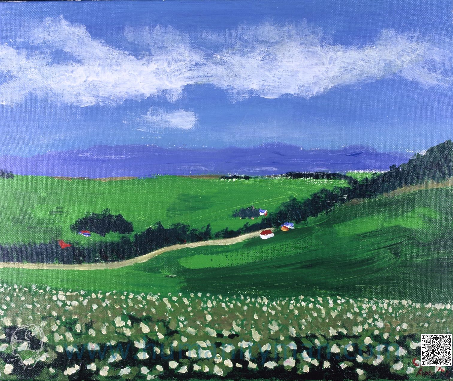 夏之丘 林布蘭壓克力彩 麻畫布 F8 1998年 北海道美瑛町,這麥田的豐腴就是當地人多年的努力,許多攝影家在這裡成名,而旅人的我也跟著高興,因為我知道今年秋天他們會豐收。天上的柔軟白雲使用鋅白不規則塗成。_