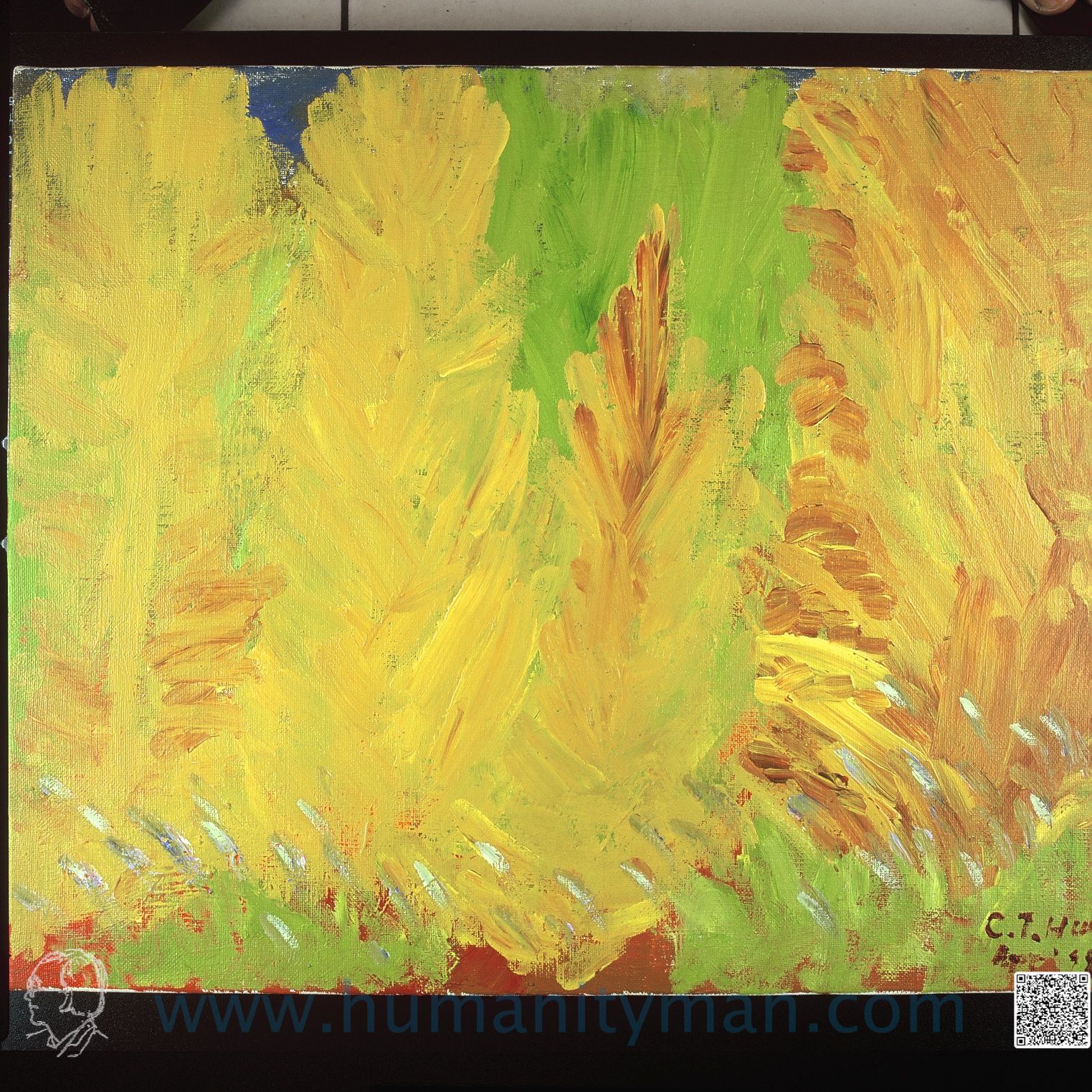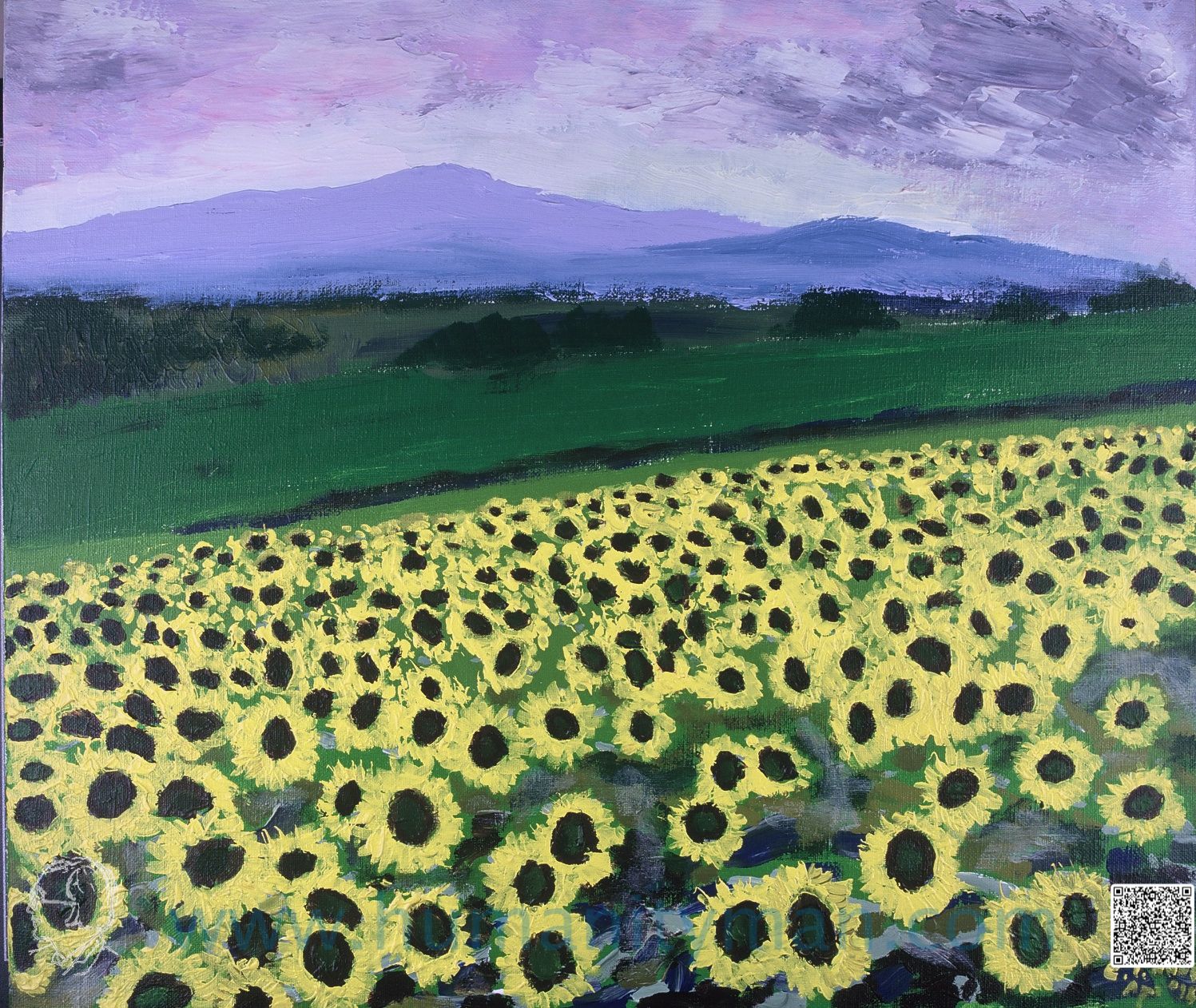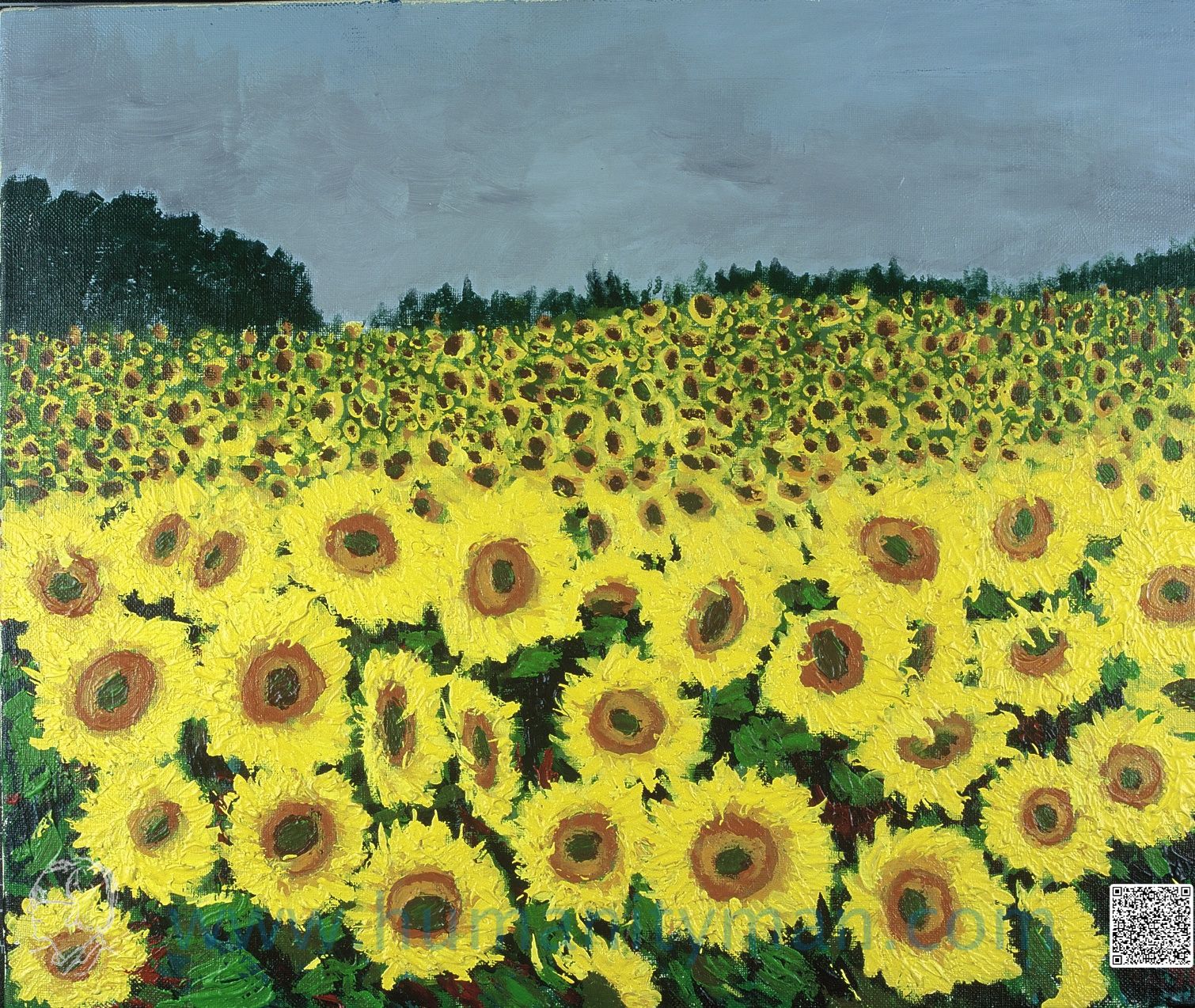 向日葵 林布蘭壓克力彩 麻畫布 F8 1998年向日葵是女兒最喜歡的花。向日葵非常可愛,又有經濟價值,可作葵花瓜子、葵花油、鳥類的飼料等,北海道栽培很多,有如日照多的南歐一般。_