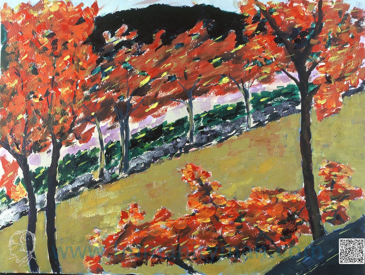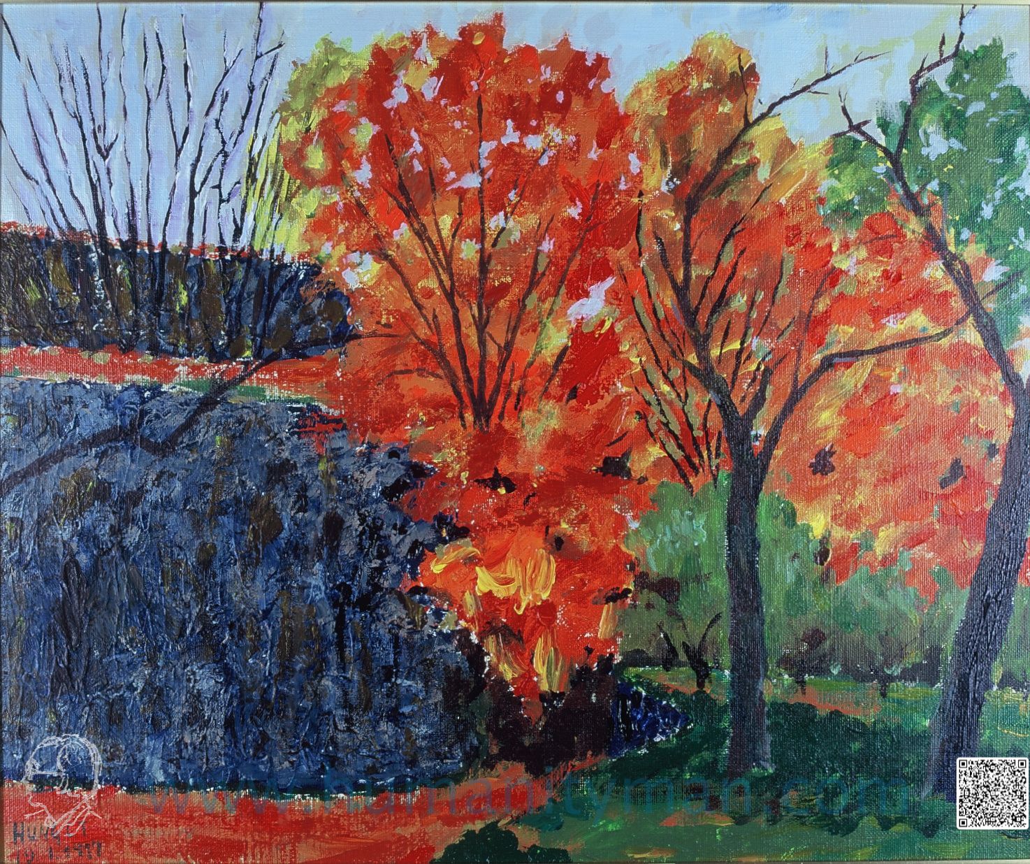 日本的深秋 林布蘭壓克力彩 麻畫布 F8 1998年其實日本的楓紅是在初冬才變化,因為日本的中心在本州的中部的東海道,那就是蘇北的緯度,再加上海洋的暖流,因此比較像法國或西班牙的地中海岸,所以秋楓來得特別晚。_