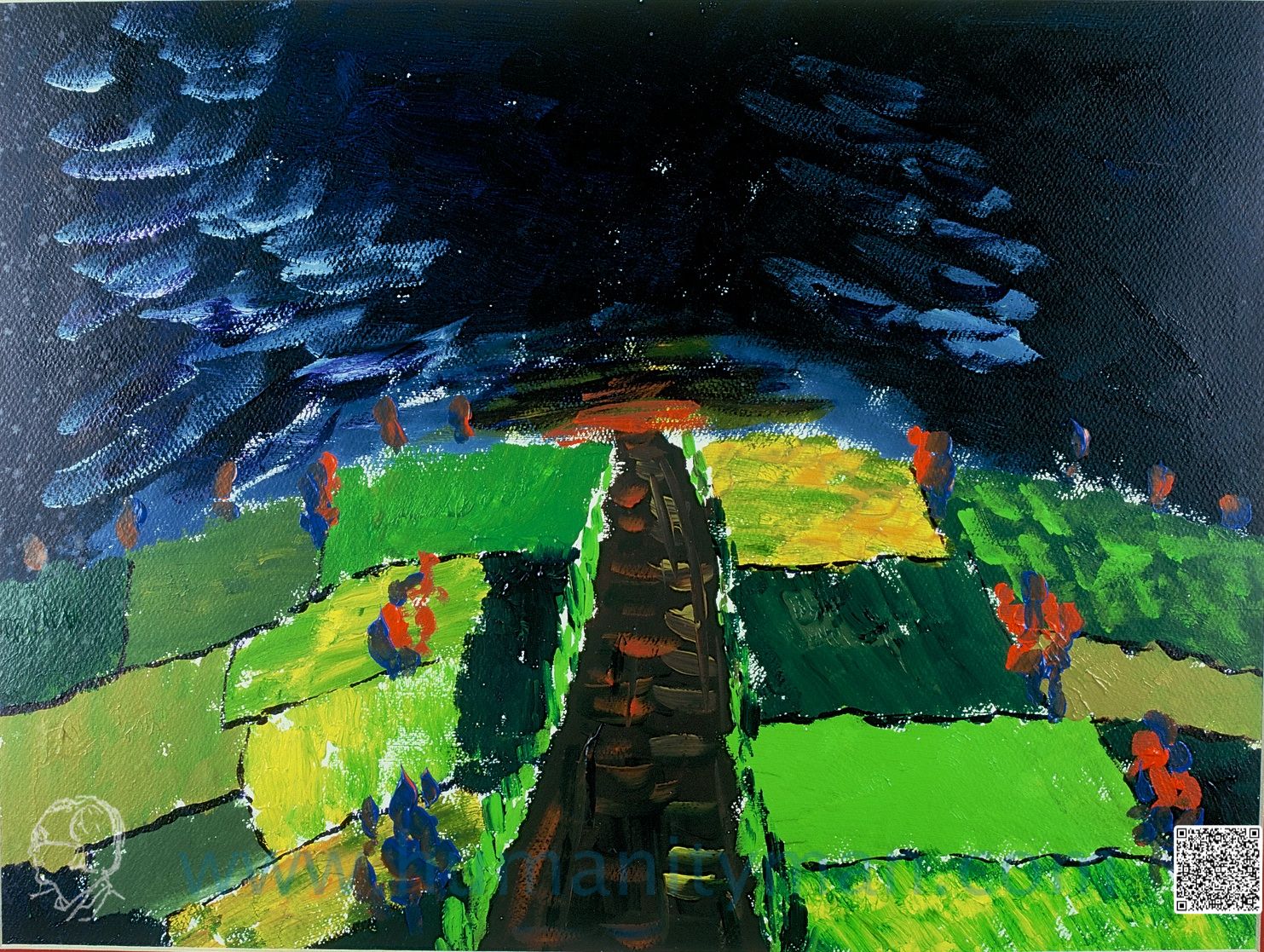 直直的前面路孤寂的我溫莎牛頓壓克力彩 水彩紙 八開 1997年這是山頭火先生的俳句。我根據他的日文俳句,描寫一個異國晚輩對他的了解,用的是鮮艷的原色,有梵谷之風,因為感到生命的無助是同理的吧!_