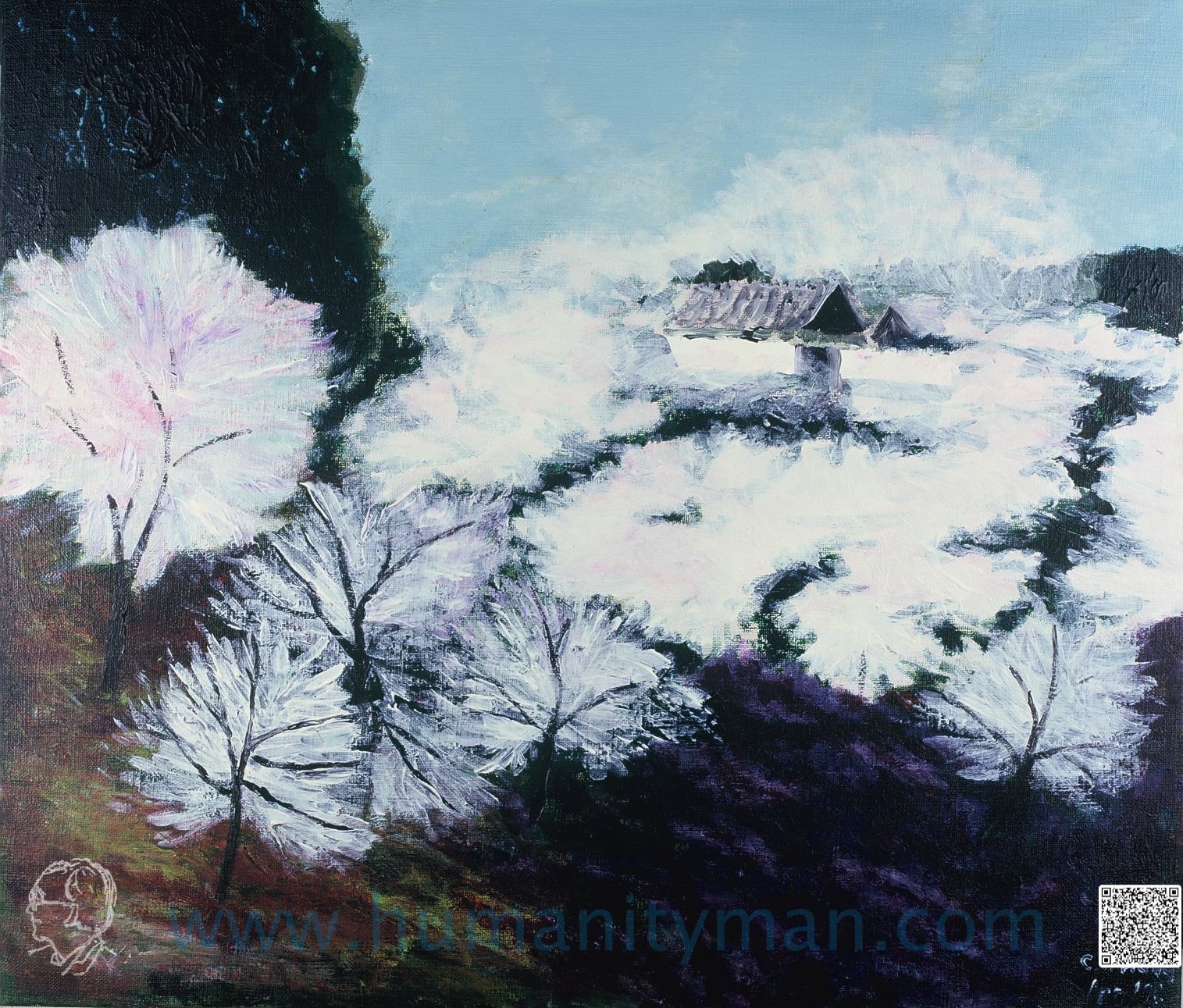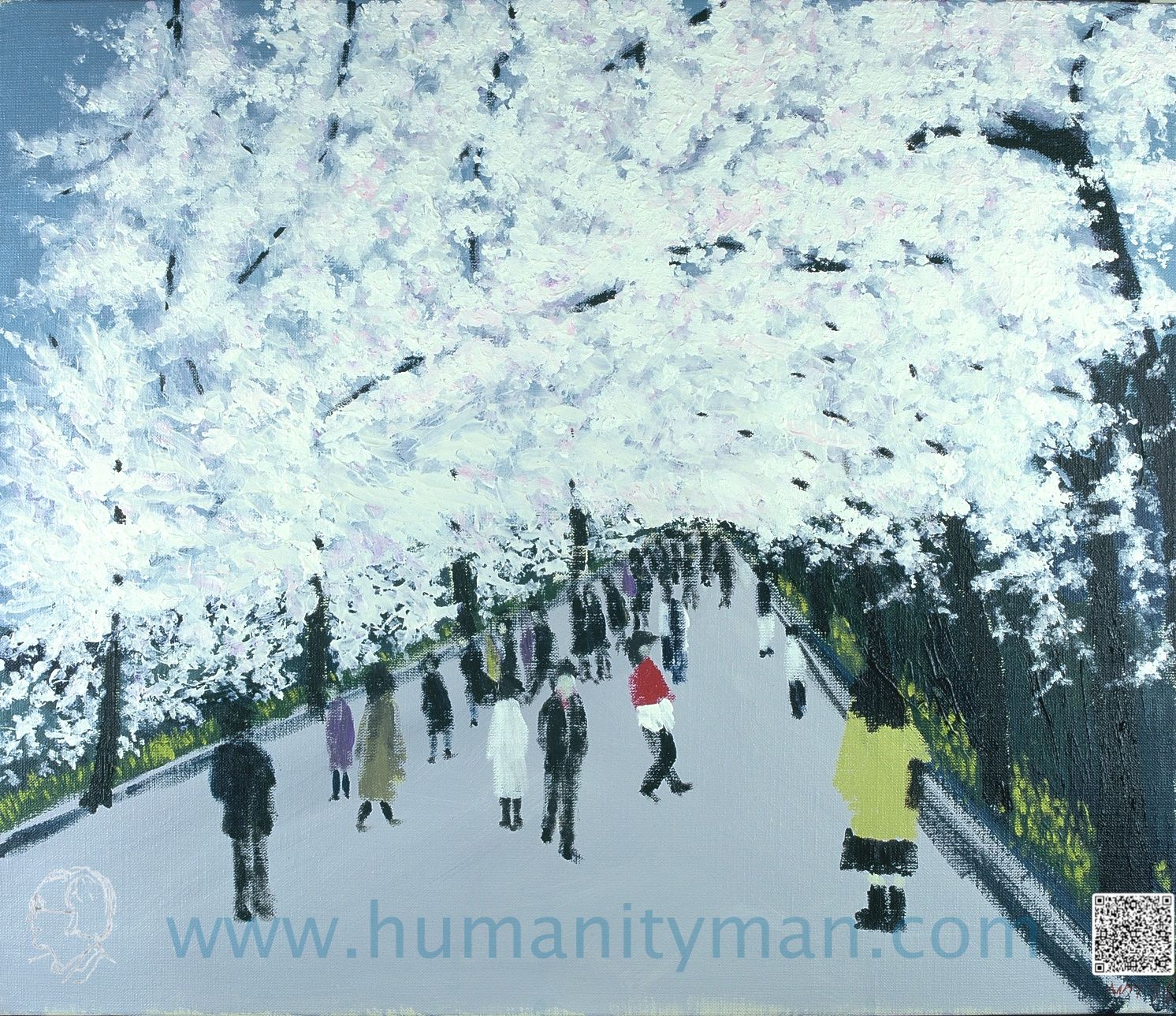 田安門前 林布蘭壓克力彩 麻畫布 F10 1998年 這是在靖國道的路邊往南望北之丸公園的入口,田安門的櫻花已開滿天,前後左右全都被絲綢狀的櫻花包圍起來,人們攜帶相機,人人捕捉鏡頭。_