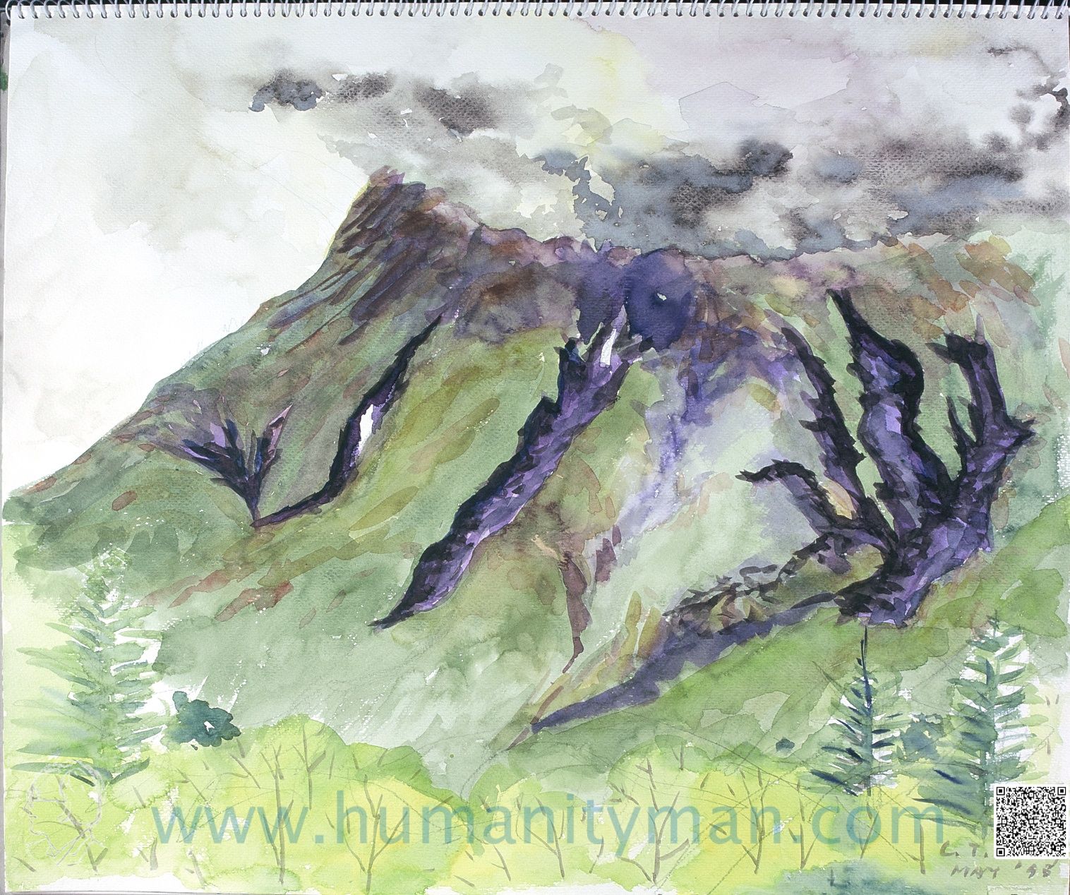 下雨時的燒岳 溫沙牛頓水彩 日本水彩紙 F8 1998年下雨了的燒岳被遮蔽了山峰,看不到活火山的形狀,反而有點像西遊記的騰雲駕霧。_