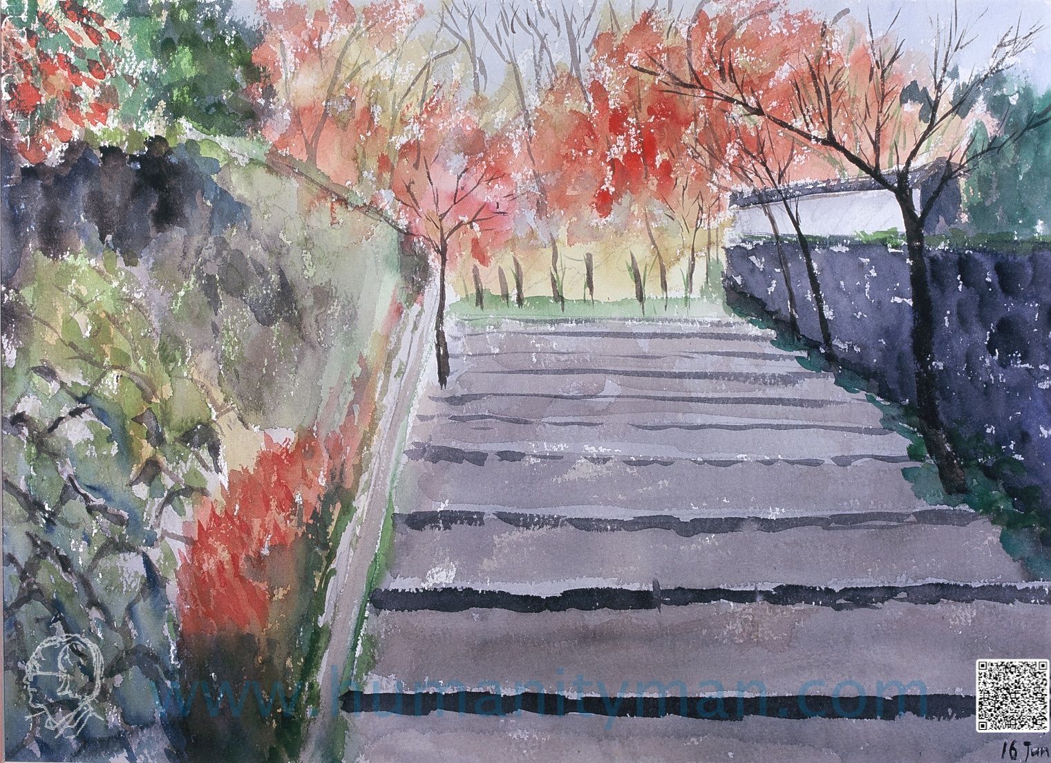 三千院前的石階 林布蘭水彩 桑得士水彩紙 八開1996年三千院前的石階,畫端的左邊就是三千院的遺蹟,這是天台宗的系統,曾經在1200年前由最澄上人開山,被榮封國師,現在殘存的三千院並不大,只有一些庭院及院內展示,外面楓紅山丘唯美。_