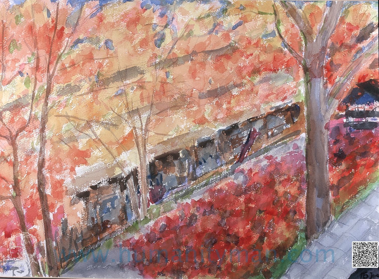 三千院往下望林布蘭水彩 桑得士水彩紙 八開1996年這是在三千院圍牆的石塊上站著,然後往下望,石瓦在右下方可見,由於眼睛的焦點不在這兒,因此不列入焦點。焦點在對面小屋,整排商店在楓紅之下好像特別有味道。_
