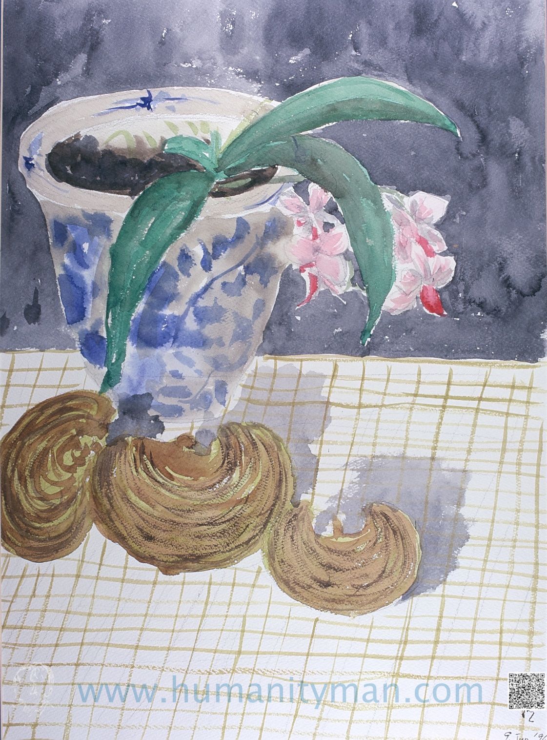 蘭花與靈芝林布蘭水彩 水彩畫紙 八開 1996年蘭花與靈芝是國人喜歡的植物,在靜物的處理上也只是表現平平凡凡地立在桌上,水彩靜物比較容易成功。不過水彩本身是畫「負」的,也就是畫深色時,保留底色,與一般人行事習慣剛好相反。_