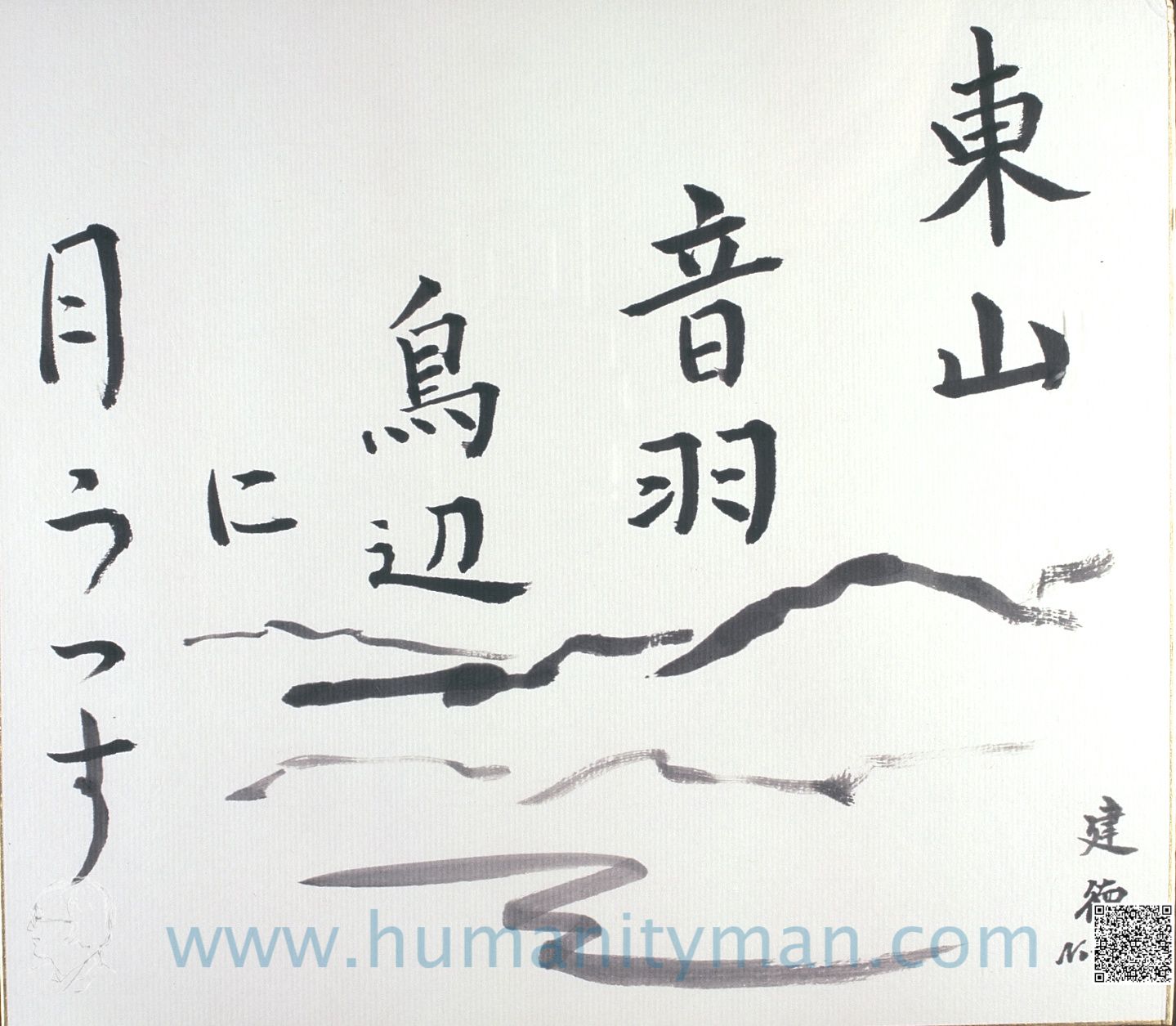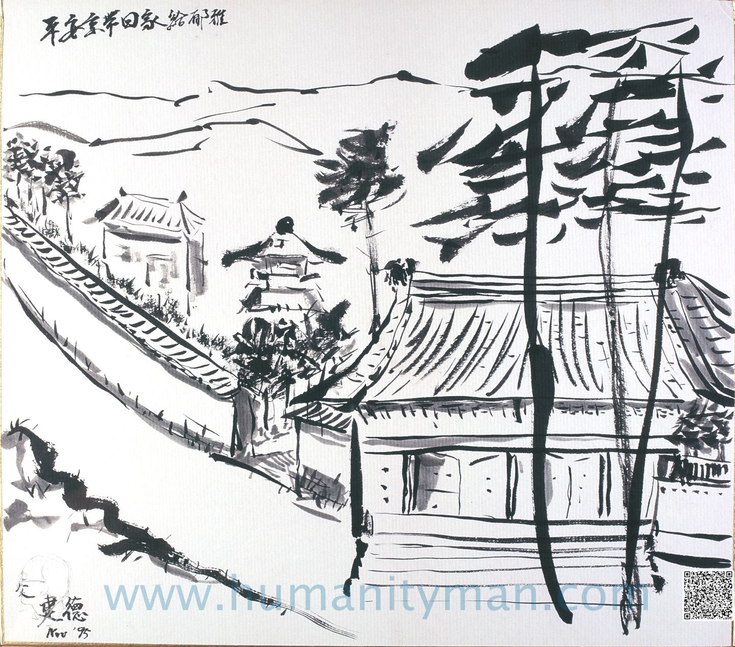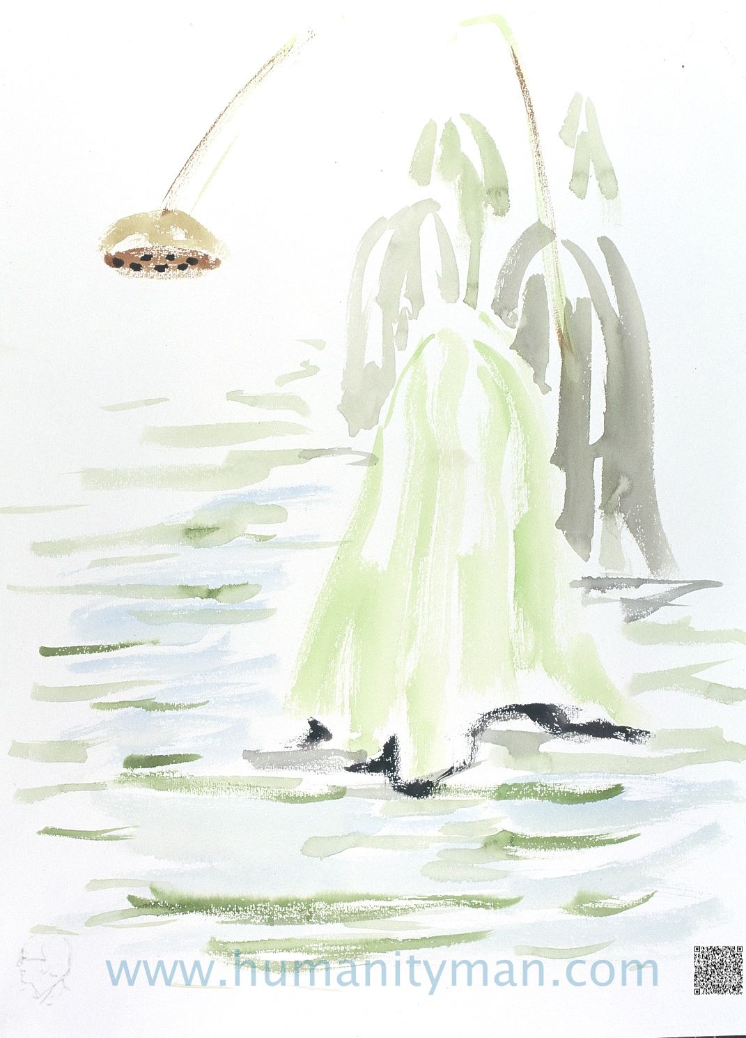 傳 水彩 日本褚紙 F8 1996年 這是日本徘畫習作,內心平靜,精神集中。不考慮透視、顏色、只表達意念,手要快,否則心一走,就畫不出來了。不可能像畫油畫那般一而再、再而三的重疊,反而是描寫當下的感動。_