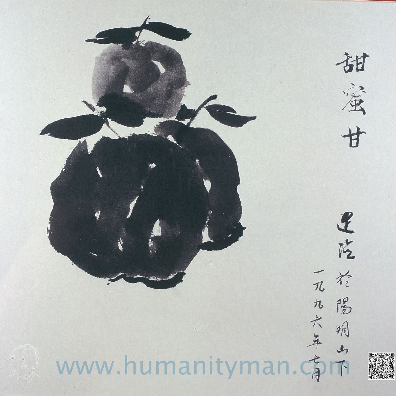 甜蜜甘水墨 日本褚紙 F8 1996年柑橘的顏色從橙黃到橘紅,桔色與吉祥同字形,吃了又非常甜美,形狀的圓球更象徵美滿,因此一直是東方傳統的吉祥植物。本作品靈感自日本徘畫,靜物為椪柑。_