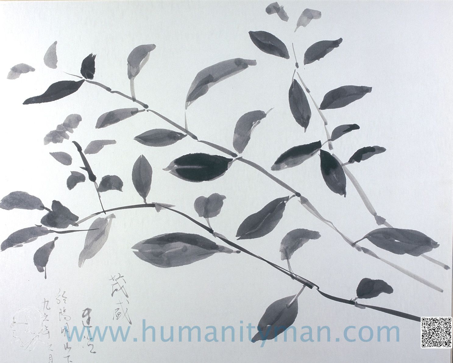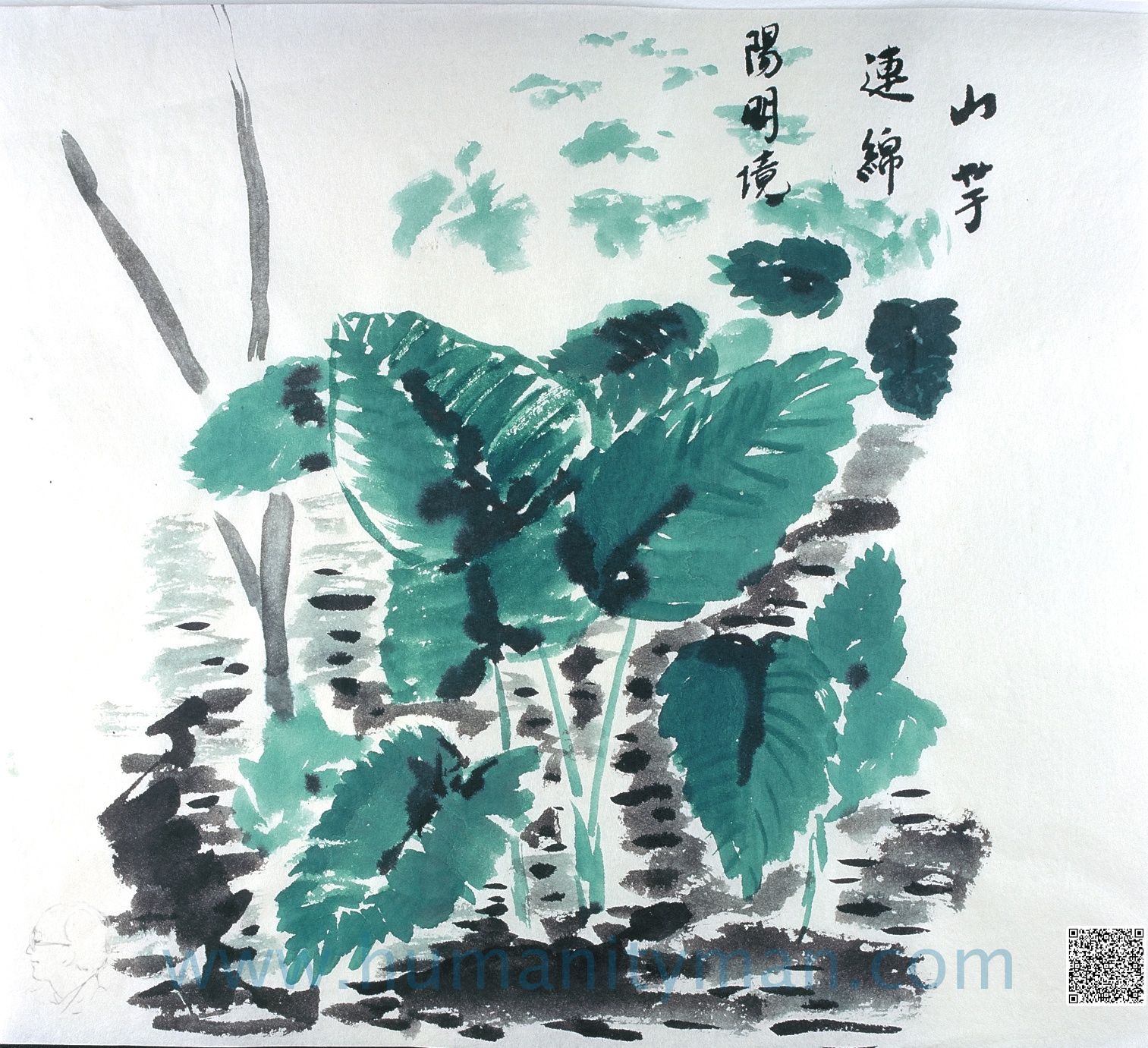 山芋連綿陽明境之二林布蘭水彩-水墨 日本褚紙 F6 1996年這是毛筆沾水彩的習作,試圖克服不東不西的不調感,水彩是翡翠綠Emerald green。_