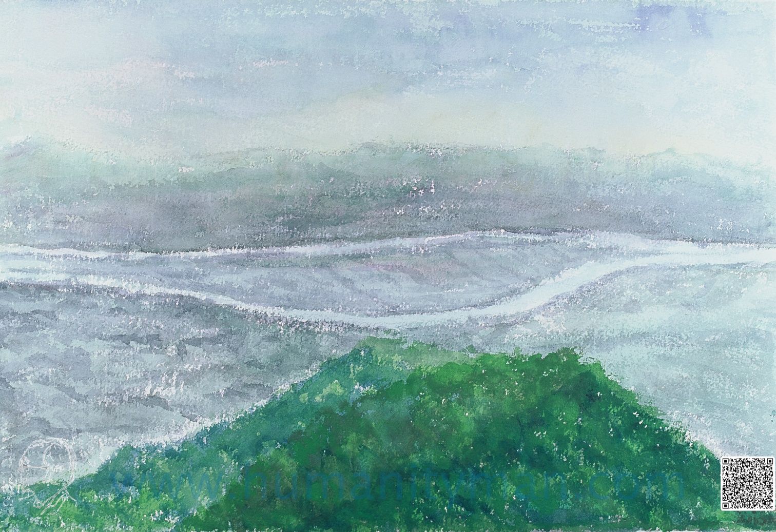 矇矓淡水四開 Archea紙 850公克 粗目從紅毛城對面飲料簡餐店領事館陽台望巴里觀音山,能見度似乎非常低?