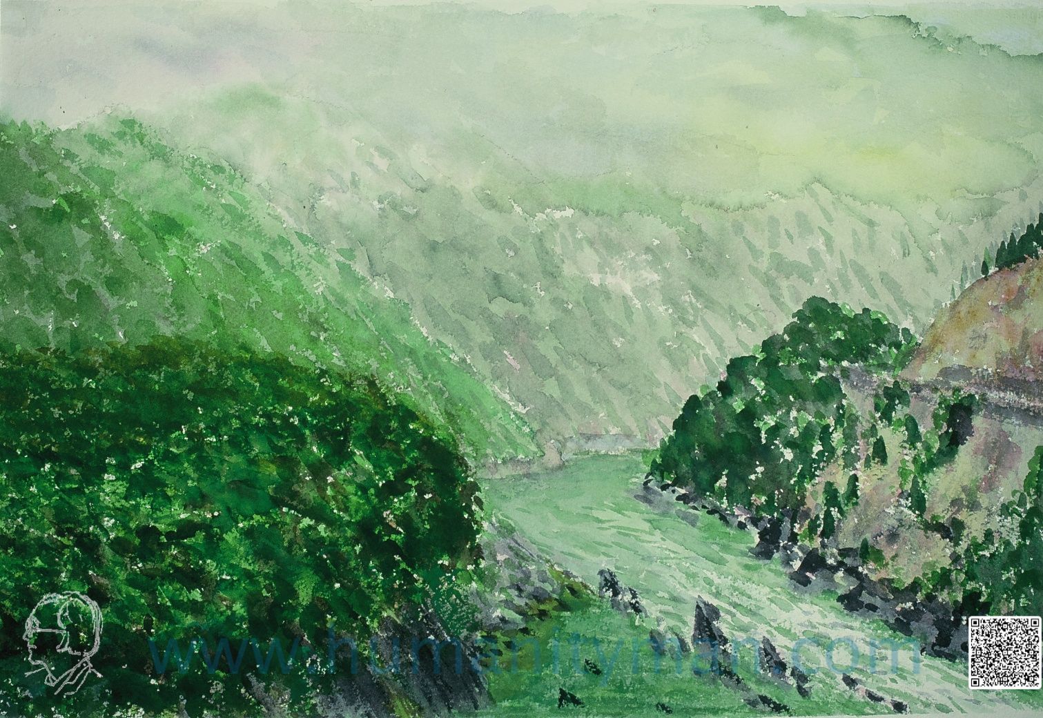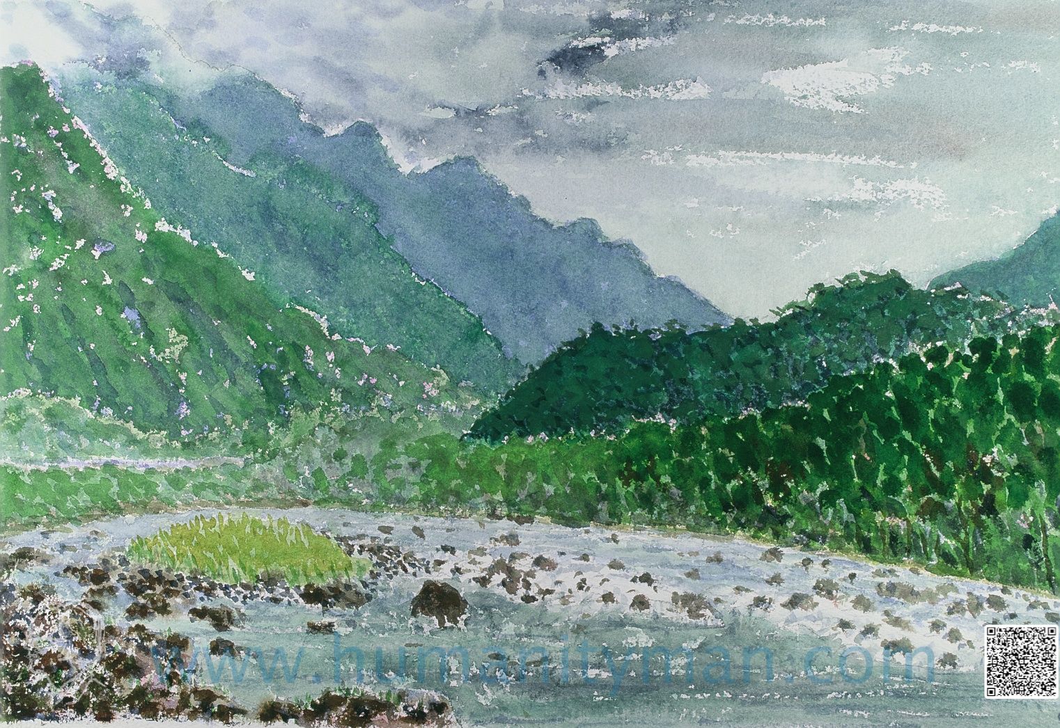 平溪時雨 四開 Arches紙 850公克 粗目五層的山川水木,加上朦朦的北台灣天空,忽然間下起雨來了。