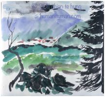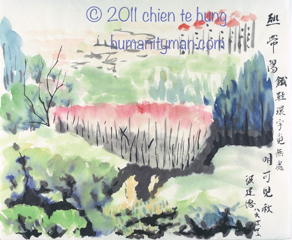 京都大原林布蘭水彩/水墨日本褚紙 F8 1996年 這是一個新的嘗試,大家都清楚,水彩紙與水墨紙都是棉紙,但是個性相差很多,都能吸水,水彩紙有表面處理過,水彩紙吸得慢,可以平塗(wash)顏料,而水墨紙則一下子就吸乾了,所以水墨畫要看毛筆的筆觸了,這是京都楓紅,我用水彩顏料習作,背景的山都紫出顏色來了。這就是京都盆地的東北緣,相當士林天母一帶。