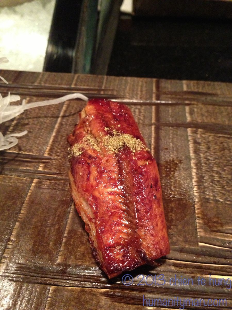 我一直不喜歡吃鰻,因為受不了泥臭味,吃慣了穴子,有一次吃一下東京高島屋百貨上的蒲燒鰻大桶櫃,覺得口感與香味別具,所以也愛上牠了(圖4)。一般蒲燒鰻很少上壽司吧,日本偶而可以看到(圖5),鰻柳川鍋則是,把蒲燒鰻切小塊,與牛蒡絲、雞蛋醬煮在一個平底陶板鍋上(圖6)。
