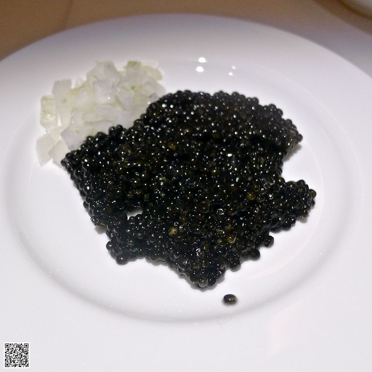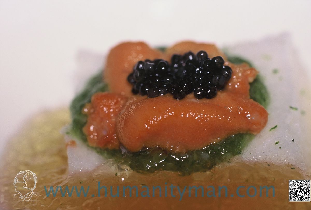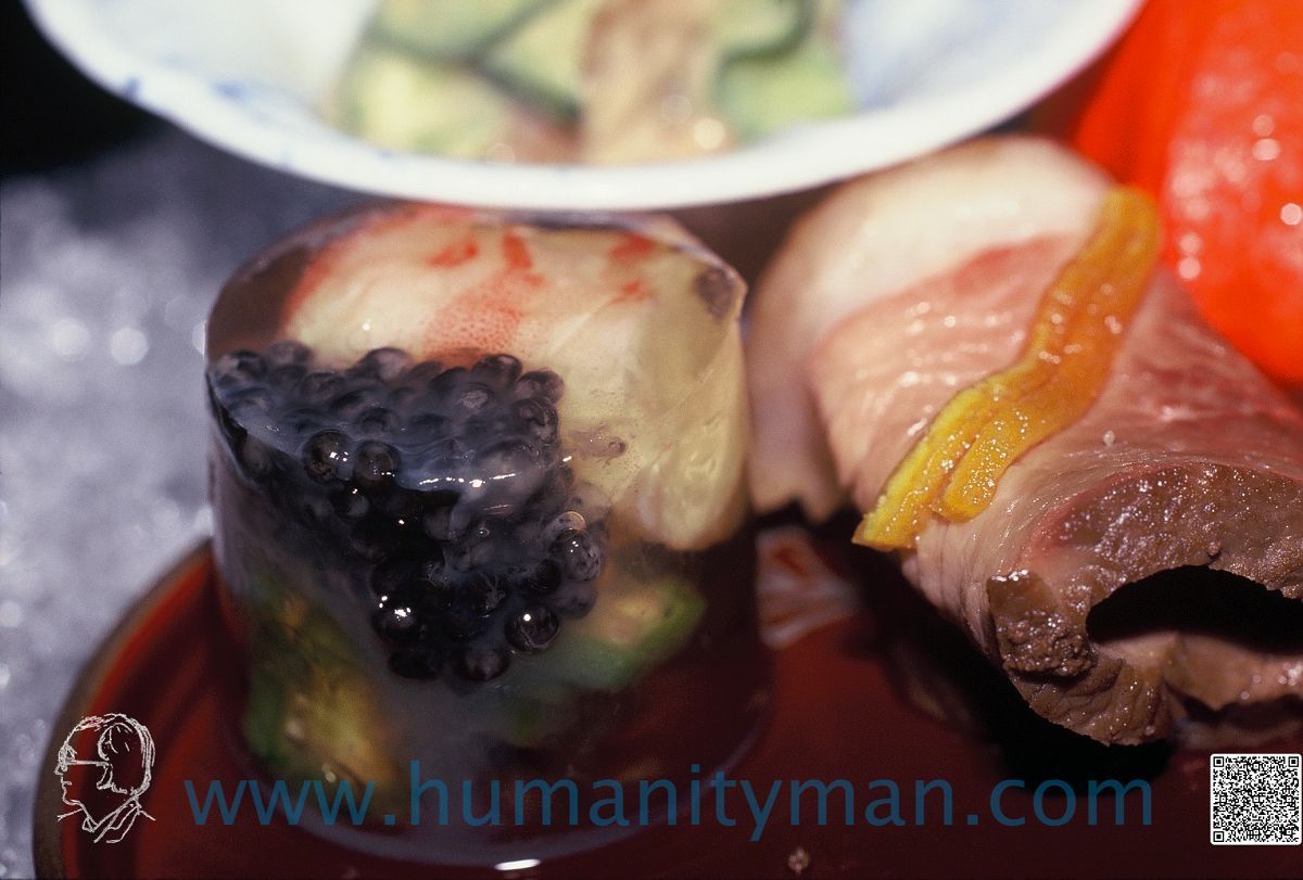 至於『千斤腊子萬斤象』的大陸,現在也大量養殖生產腊子的鱘魚,台灣廬山也有生產各種鱘魚,日本則較早投入,已經有國產的鱘魚魚子醬,至於味道如何,據衛星電視的報導,食客說味道不同於伊朗或俄羅斯產的,我在日本吃會席料理時,在前菜上,偶會出現魚子醬,量太少了,才幾粒還是嘗不出味道,只覺鹹鹹,黏黏的(圖2, 3)。日本製魚子醬已經大量供給日本料理外,也供應該國的法國料理餐飲,現在鵝肝自製,魚子醬也自製了。