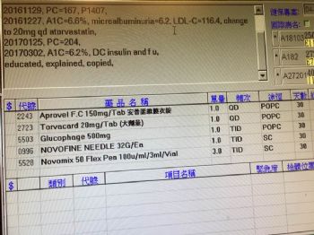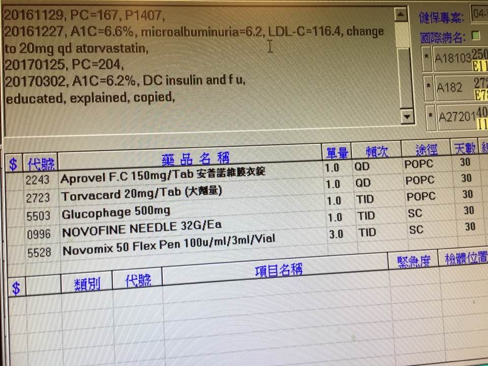 這位58歲的男性,在去年8月23號,因為血糖超高,在外面已經三年都降不下來,所以我加了胰島素4單位混合性的,每天打三次,他屬於中等度配合,到今天我已經可以把胰島素停掉了,因為他的醣化血色素已經降到6.2。